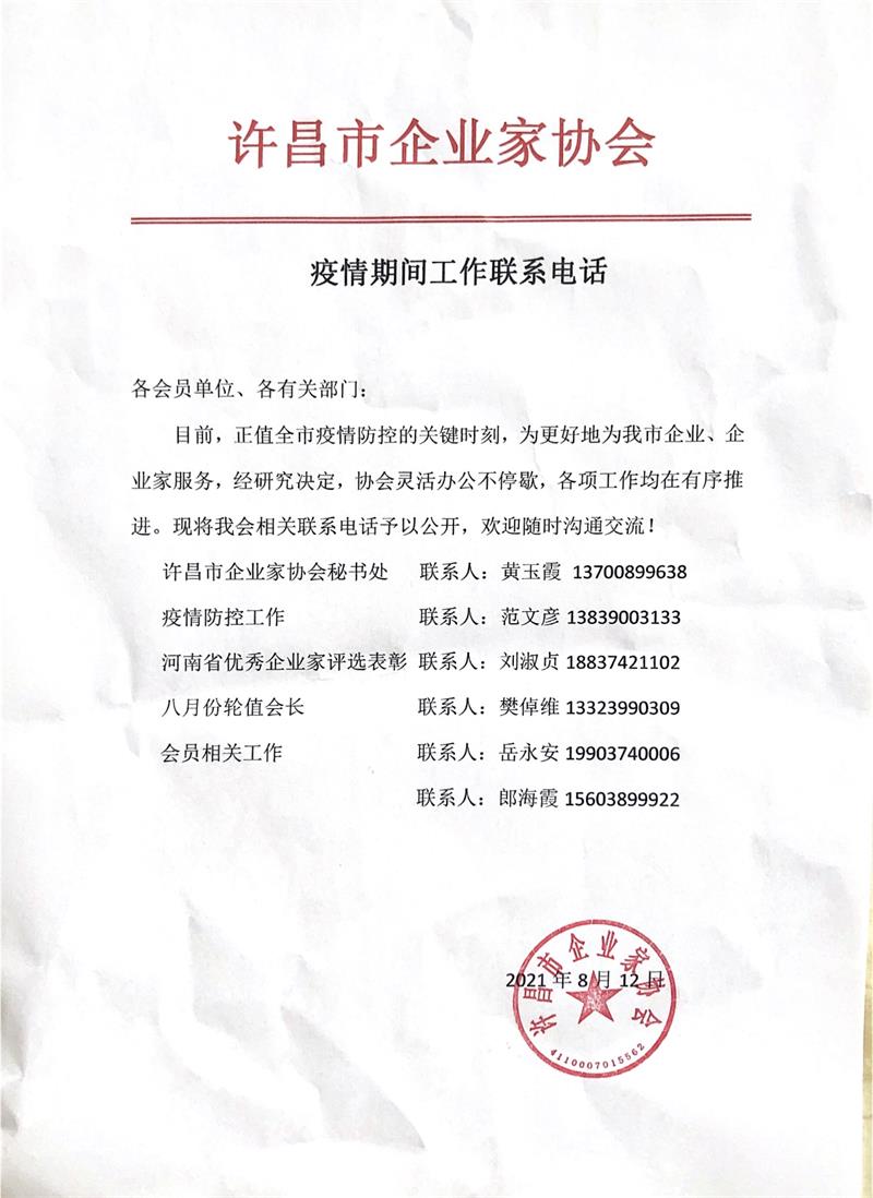 8月12日,为更好服务我市企业、企业家,协会灵活办公不停歇,协会将相关联系电话予以公开,欢迎随时沟通交流!