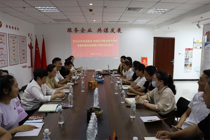 2023年6月26日下午,许昌市企业家协会联合会员单位河南信誉税务师事务所举办金税四期企业财税合规沙龙培训会,特邀请注册税务师、许昌市人大代表、河南信誉税务师事务所总经理杨晓会授课,协会22家企业代表参会。