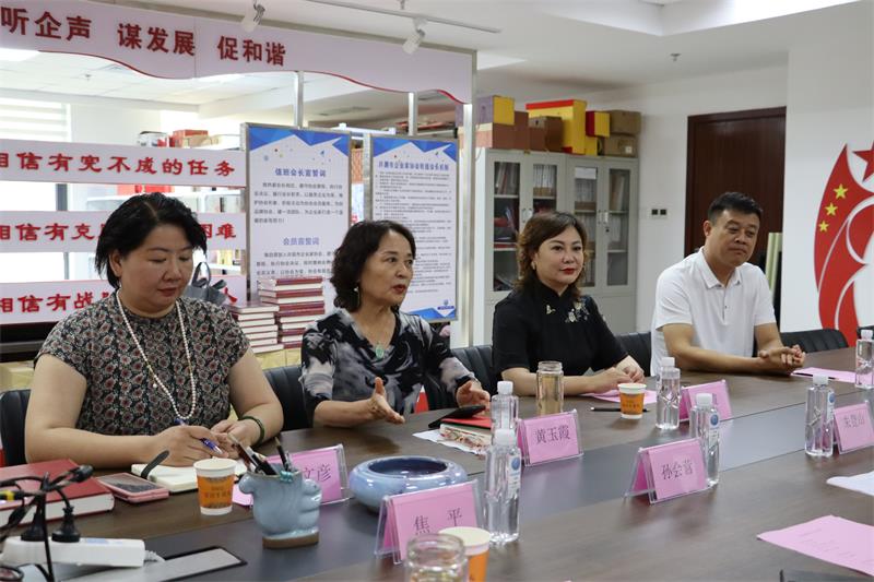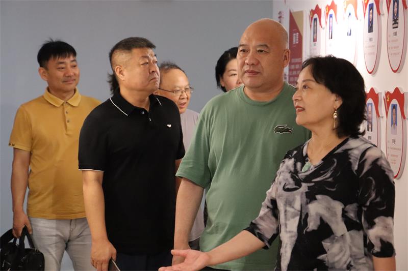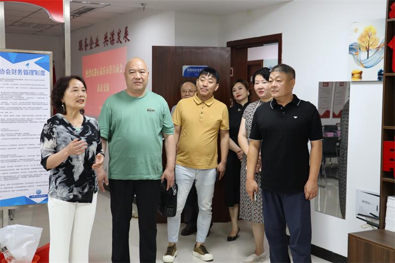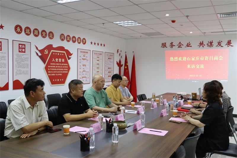 6月21日上午石家庄市许昌商会会长朱登山、 执行会长孙会营、贾克辉、秘书长焦平、副秘书长王建民一行5人莅临我会参观交流。市工商联副主席曲钊霞对到访的兄弟商会表示热烈欢迎,我会秘书长黄玉霞、执行会长张建涛、副秘书长范文彦热情接待并进行座谈交流。 通过参观文化墙、观看宣传片向来宾展示了协会历程和发展情况。