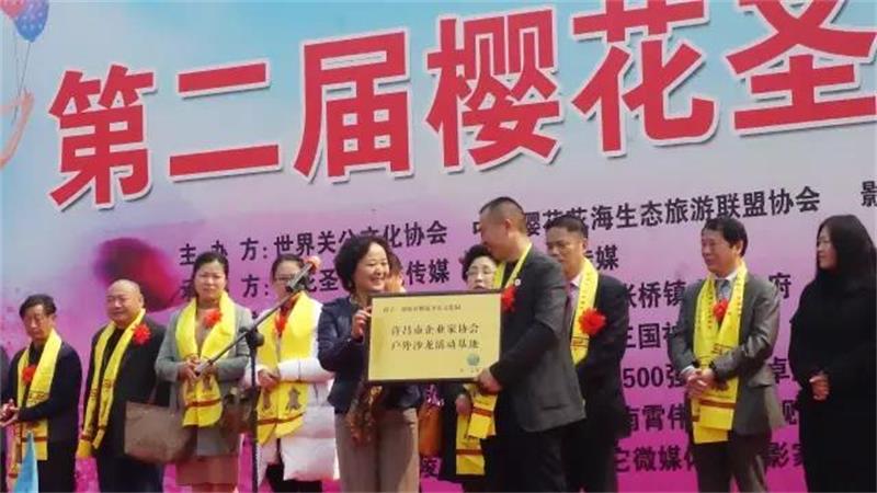 企业家协会秘书长黄玉霞向鄢陵樱花圣帝园授企业家协会户外沙龙活动匾