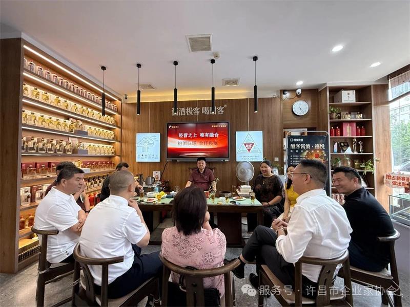 2025年6月24日下午,由协会主办的"酒食共生 链动商机"行业资源对接沙龙在许昌酣客酱酒体验馆隆重举行。本次活动汇聚协会内部8家知名餐饮企业与酒水行业代表,旨在搭建企业交流平台,促进资源共享与合作共赢。