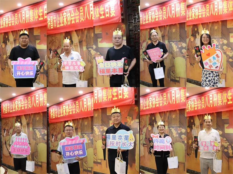 8月7日晚上,许昌市企业家协会8月份集体生日宴,在世春阁酒店温情举办。秘书长黄玉霞、妇联主席曲钊霞、值班会长任天培等共20位协会会员相聚共度生日宴。