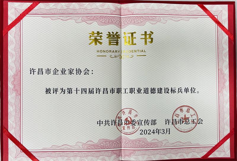 3月27日,许昌市企业家协会被中共许昌市委宣传部、许昌市总工会评为“第十四届许昌市职工职业道德建设标兵单位”。
