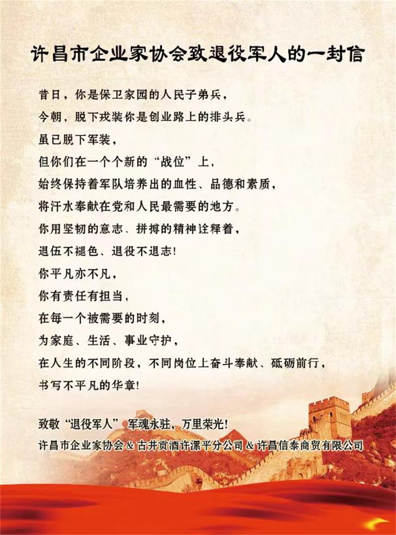 本次“八一”表彰活动,在协会内外广大退役军人中产生了热烈的反响,进一步提升了退役军人的荣誉感、获得感,激励引导广大退役军人扬正气、树标杆、展风采、续传承。一名退役军人,就是一面旗帜,愿退役军人企业家们勇往直前,开创更加辉煌的未来。特别鸣谢单位:古井贡酒许漯平分公司