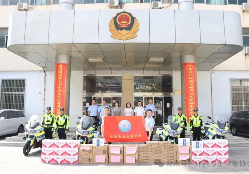 黄玉霞秘书长一行为支队民辅警赠送了矿泉水、洗衣液等慰问品。她表示在夏季连续的高温酷暑天气下,支队交通管理工作者坚守一线、查处违法、服务群众、保障交通安全,特对持续坚守岗位的民辅警表达诚挚的慰问和崇高的敬意。吕振杰支队长代表支队全体同志向企业家协会一行表示感谢。