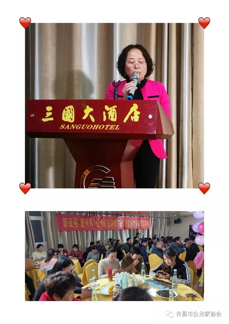 企业家协会副会长、协会顾问团团长、大盛微电股份有限公司副董事长葛娅丽,企业家协会副会长、协会顾问团副团长、许昌胖子店超市有限公司董事长王卫红上台讲话,相信在两位前辈的指导和引领,协会一定会飞的更高、更远。